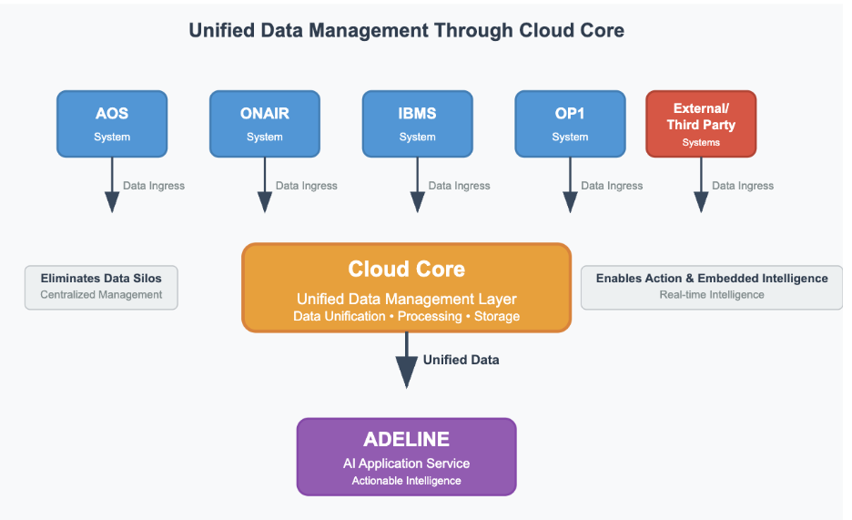 CloudCore is the central data layer for Adeline, designed to aggregate, store, and process data from across the Operative ecosystem, including AOS, OnAir, Operative One and IBMS, as well as external systems. It serves as the “single source of truth,” eliminating the data chaos that plagues converged media operations.